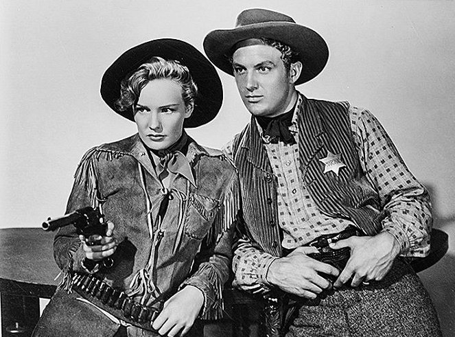 While her name appears first, the main protagonist in this Western is Sam Bass (Howard Duff). Bass, a real-life person, was a train robber but here is depicted in a mainly positive light. He is a cowboy who knows horses and hopes to earn a living to marry store owner, Katherine Egan (Dorothy Hart). But as he is a newcomer in town, he is regarded sceptically by her brother, the town’s sheriff. He wins a horse-racing bet with money lent by the sheriff, but as this seems to prove his unreliable, no-good character he loses his job on the sheriff’s ranch. A couple of bad decisions, a betrayal and the mean murder of his horse later, and his fate is doomed. The road to hell is paved with good intentions, as the saying goes!