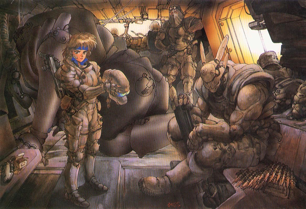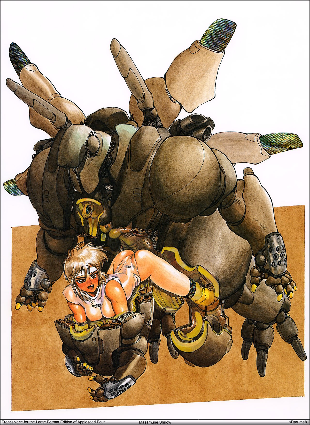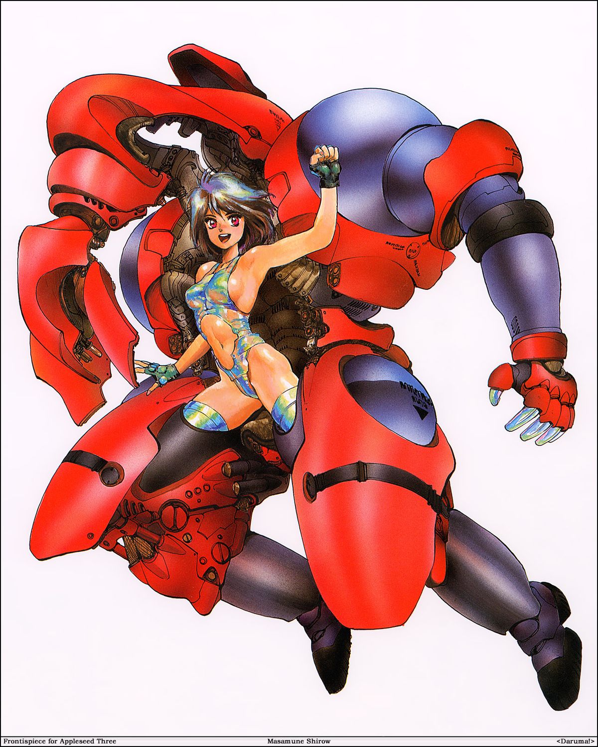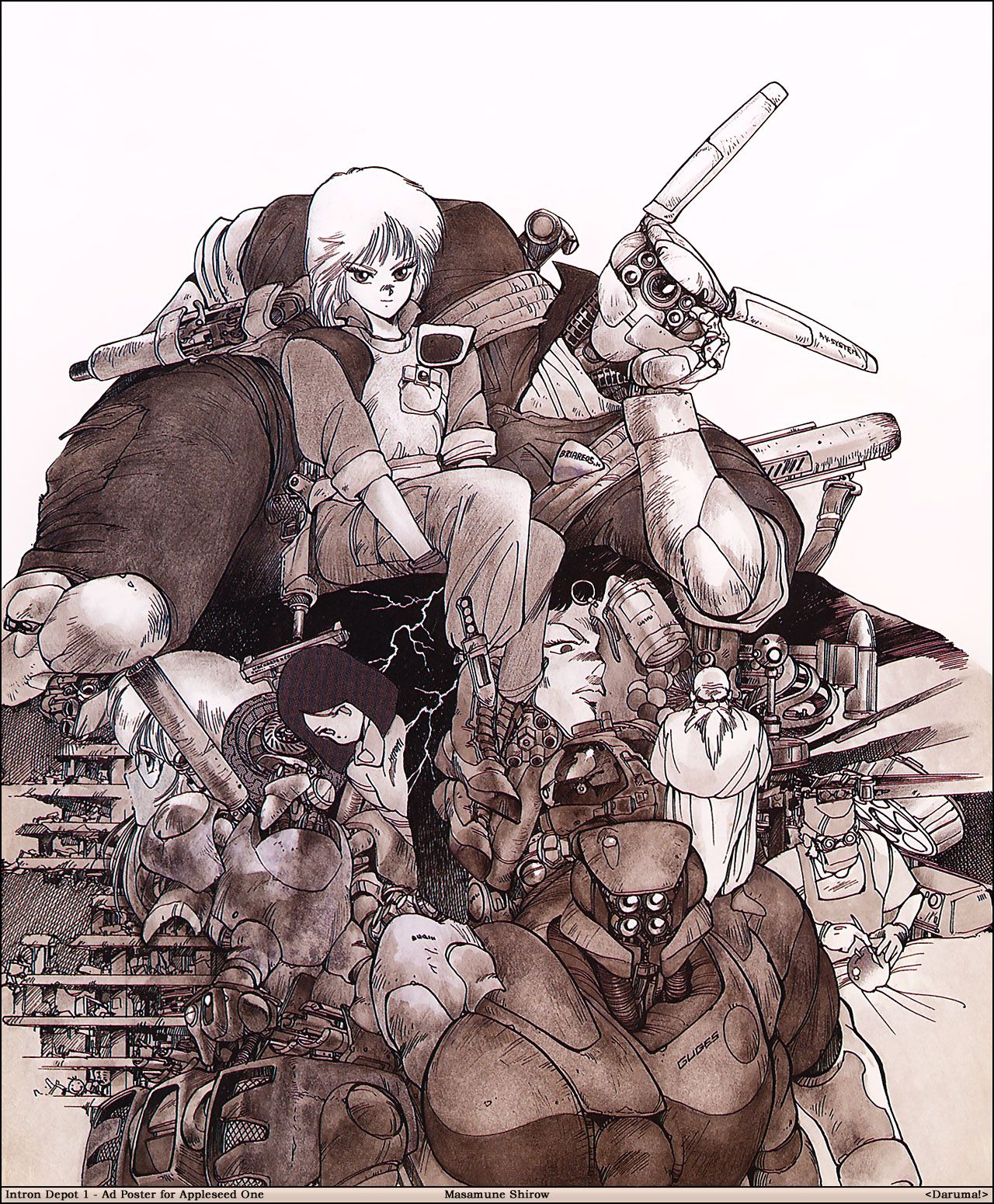 Appleseed was Shirow’s first “professional” work, coming out after Black Magic had brought him to the attention of Harumichi Aoki, head of the Seishinsha publishers. The story began appearing in February 1985. Unusually, rather than being serialized, it was released directly to paperback, but was a critical and commercial success, winning the 1986 Seiun Award for Best Manga. Three further volumes followed over the next four years; a fifth was initially serialized in Comic Gaia, but remains incomplete, thirty years after it was started. Shirow says Appleseed didn’t suit the structure imposed by the serial format.
