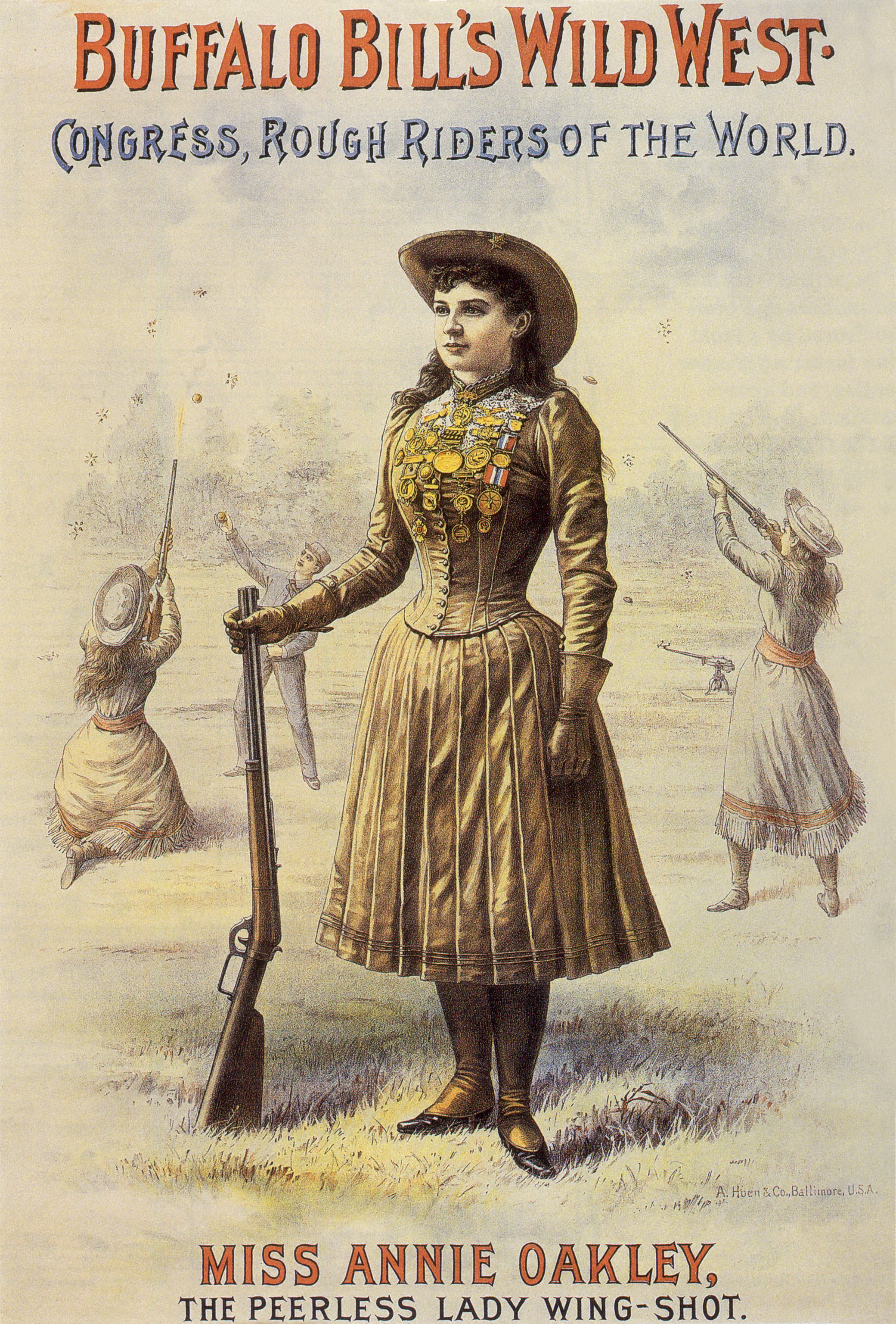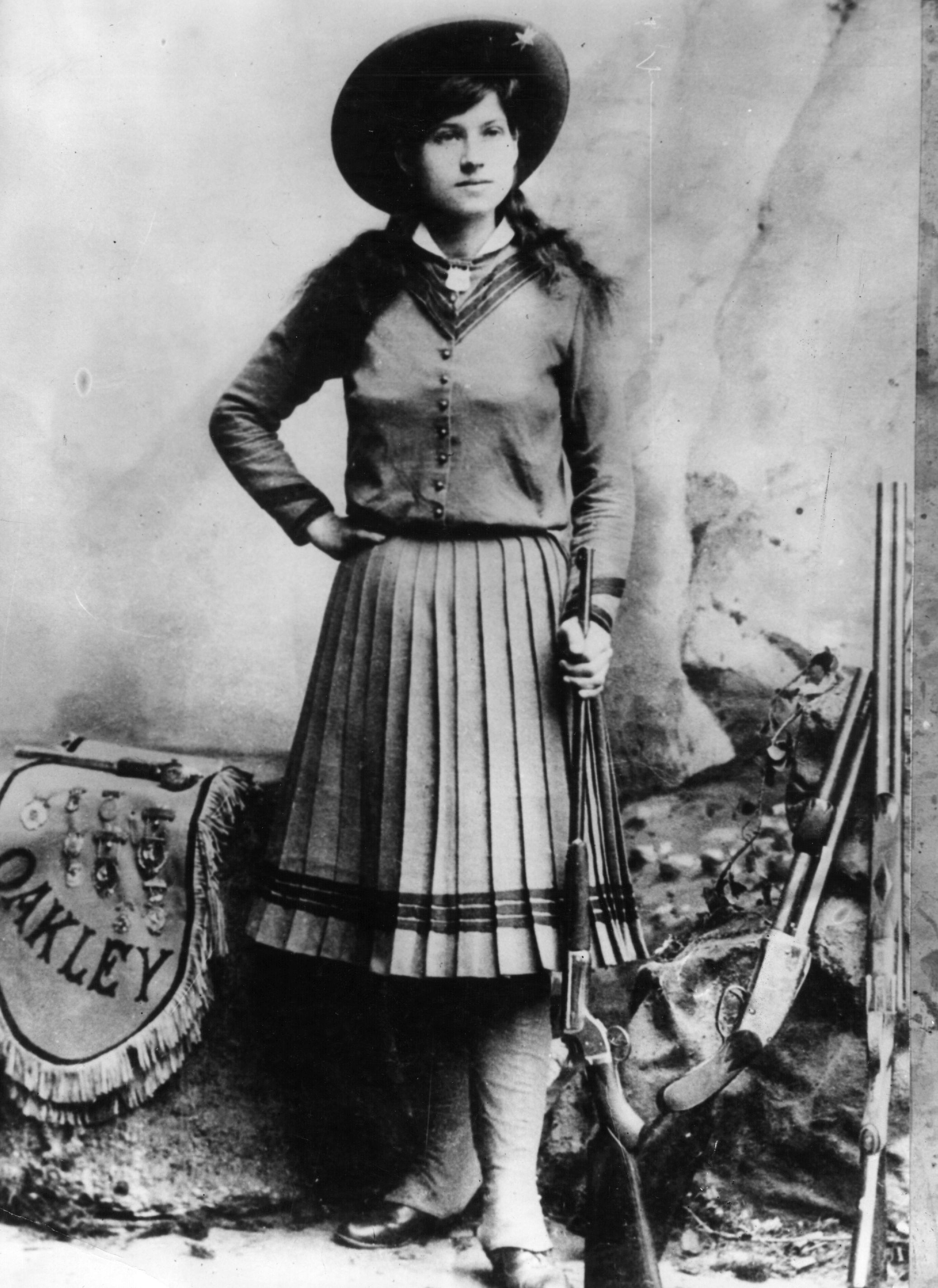 Annie Oakley was one of the earliest “girls with guns”. In her role as a sharpshooter, performing with the likes of Buffalo Bill’s Wild West show, she travelled the globe, appearing in front of Presidents, Kings and Emperors. She shot a cigarette held by the future Kaiser Wilhelm of Germany (accuracy later deplored by American newspapers, after the nations went to war in 1917). At 90 feet, she could shoot a dime tossed in midair, or hit the edge of a playing card, then add five or six more holes as it fluttered to the ground. In seventeen years and 170,000 miles of travel, she only missed four shows, and even in her sixties, could still take down a hundred clay pigeons in a row.